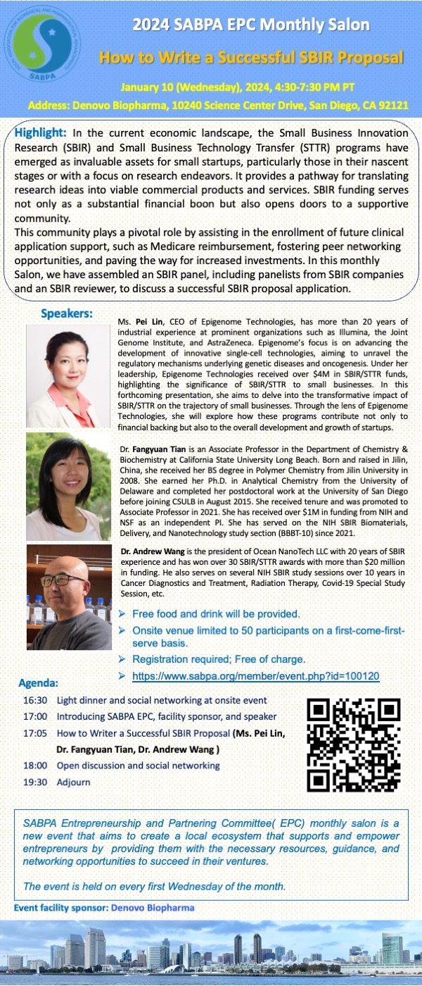 In the current economic landscape, the Small Business Innovation Research (SBIR) and Small Business Technology Transfer (STTR) programs have emerged as invaluable assets for small startups, particularly those in their nascent stages or with a focus on research endeavors. It provides a pathway for translating research ideas into viable commercial products and services. SBIR funding serves not only as a substantial financial boon but also opens doors to a supportive community. This community plays a pivotal role by assisting in the enrollment of future clinical application support, such as Medicare reimbursement, fostering peer networking opportunities, and paving the way for increased investments. In this monthly Salon, we have assembled an SBIR panel, including panelists from SBIR companies and an SBIR reviewer, to discuss a successful SBIR proposal application.
